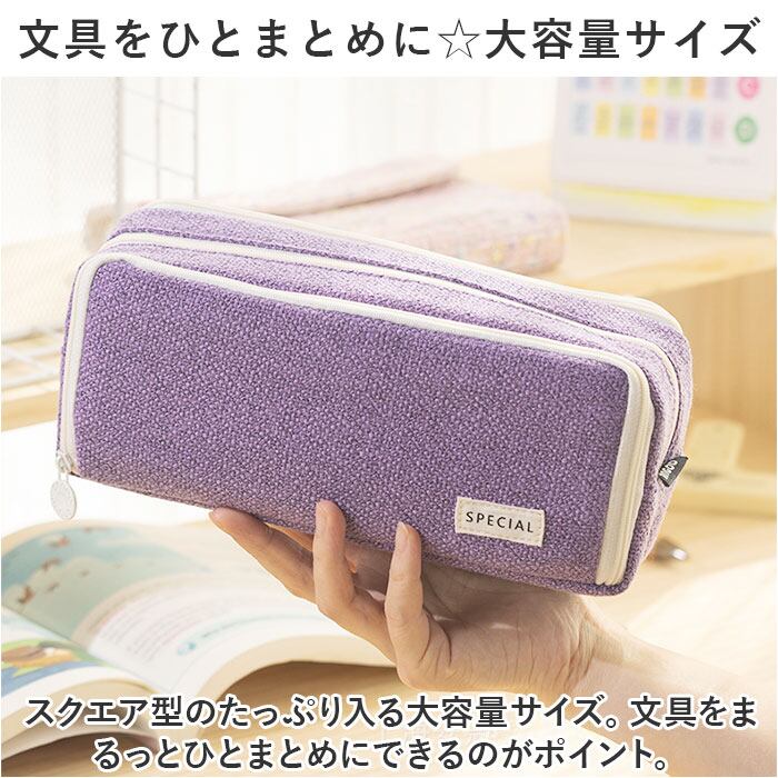 ・スクエア型のたっぷり入る大容量サイズ。文具をまるっとひとまとめにできるのがポイント。