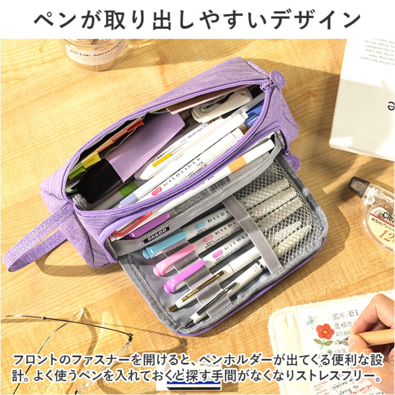 ・フロントのファスナーを開けると、ペンホルダーが出てくる便利な設計。よく使うペンを入れておくと探す手間がなくなりストレスフリー。