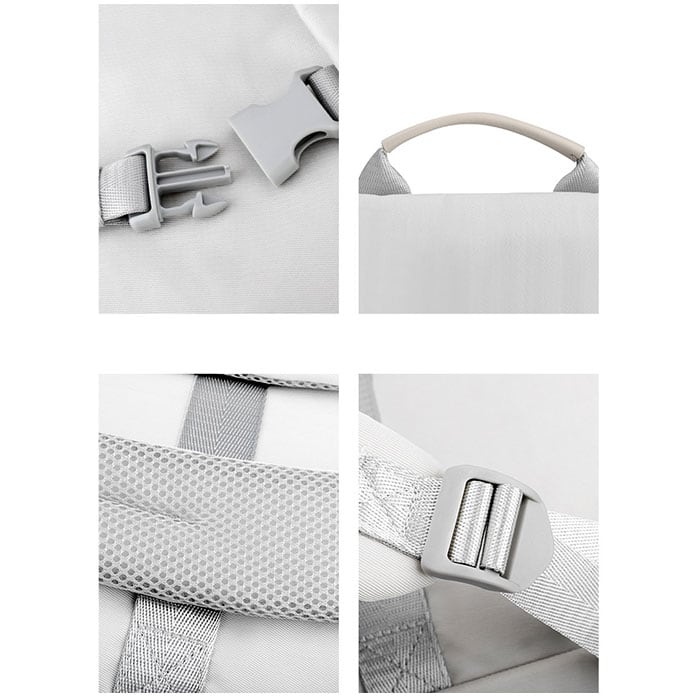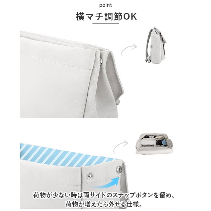 ・荷物が少ない時は両サイドのスナップボタンを留め、荷物が増えたら外せる仕様。