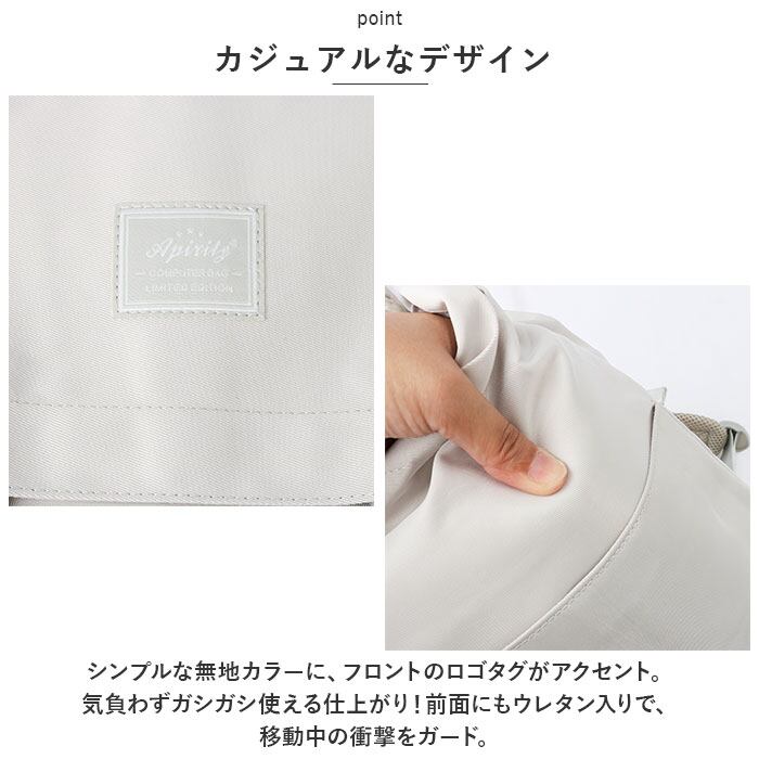 ・シンプルな無地カラーに、フロントのロゴタグがアクセント。気負わずガシガシ使える仕上がり!前面にもウレタン入りで、移動中の衝撃をガード。