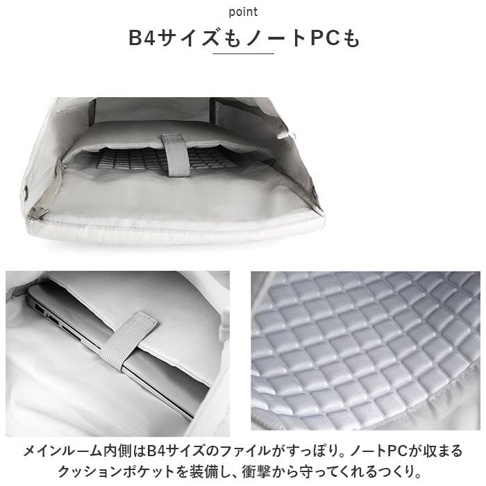 ・メインルーム内側はB4サイズのファイルがすっぽり。ノートPCが収まるクッションポケットを装備し、衝撃から守ってくれるつくり。