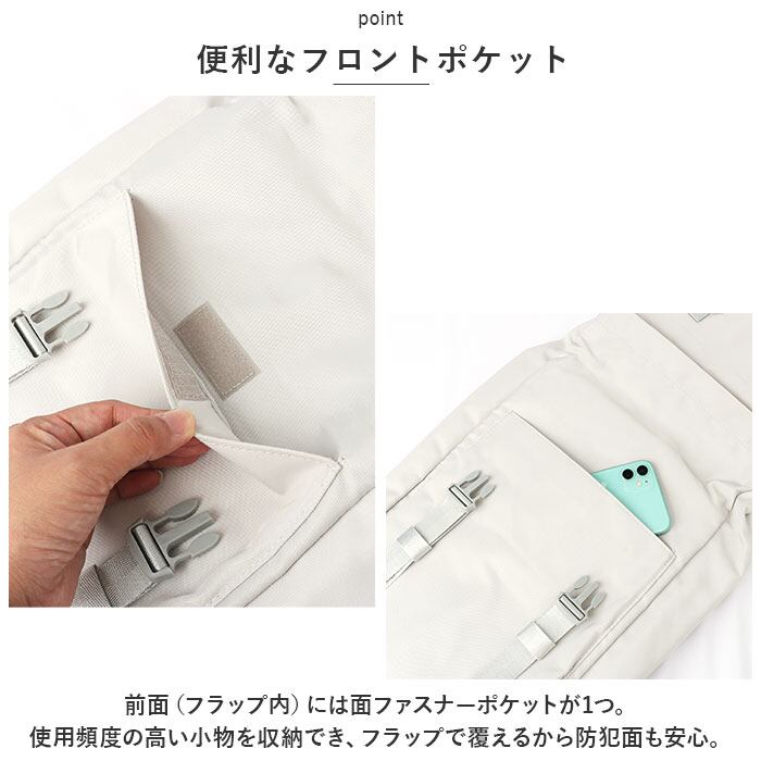 ・前面(フラップ内)には面ファスナーポケットが1つ。使用頻度の高い小物を収納でき、フラップで覆えるから防犯面も安心。