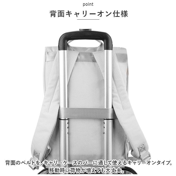 ・背面のベルトを、キャリーケースのバーに通して使えるキャリーオンタイプ。移動時に荷物が増えても大丈夫。