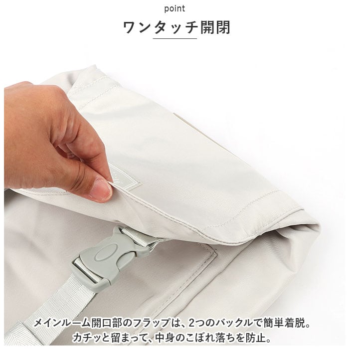 ・メインルーム開口部のフラップは、2つのバックルで簡単着脱。カチッと留まって、中身のこぼれ落ちを防止。