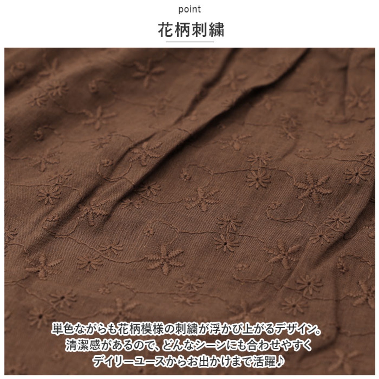 ・単色ながらも花柄模様の刺繍が浮かび上がるデザイン。清潔感があるので、どんなシーンにも合わせやすくデイリーユースからお出かけまで活躍♪
