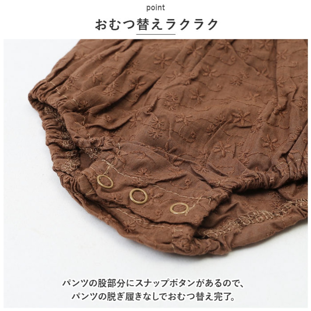・パンツの股部分にスナップボタンがあるので、パンツの脱ぎ履きなしでおむつ替え完了。
