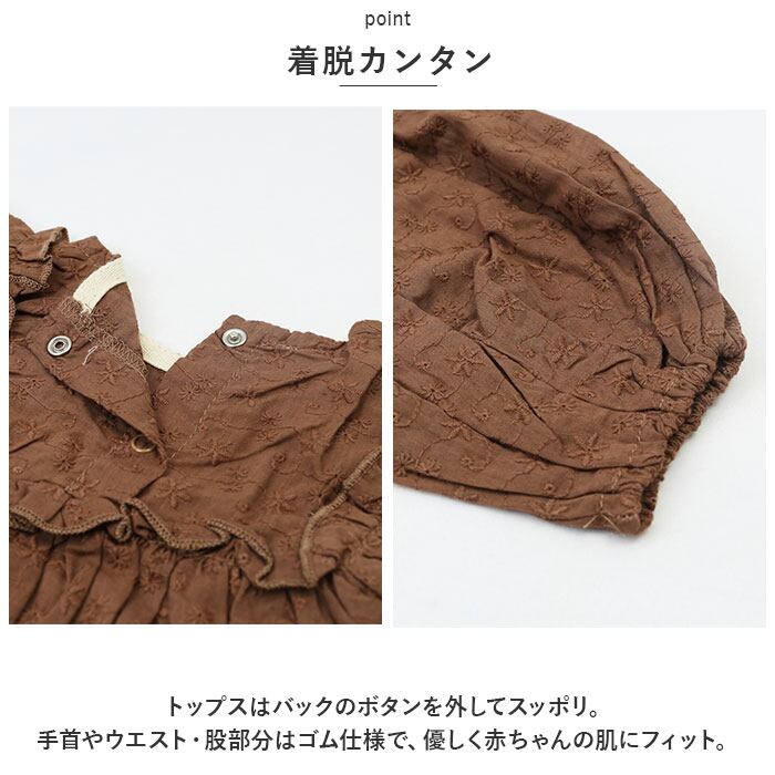 ・トップスはバックのボタンを外してスッポリ。手首やウエスト・股部分はゴム仕様で、優しく赤ちゃんの肌にフィット。
