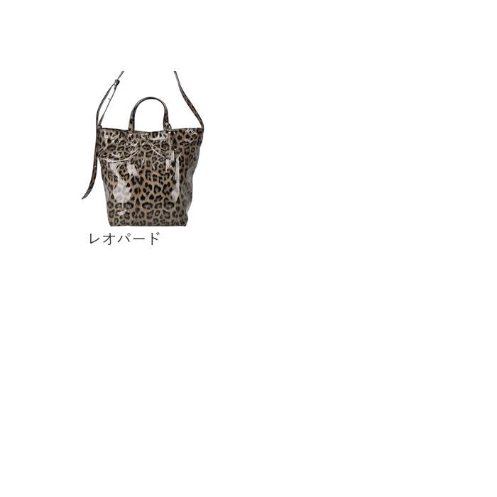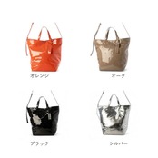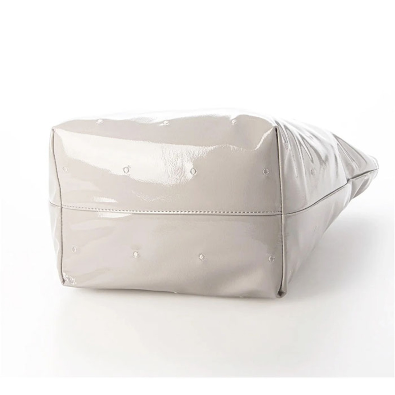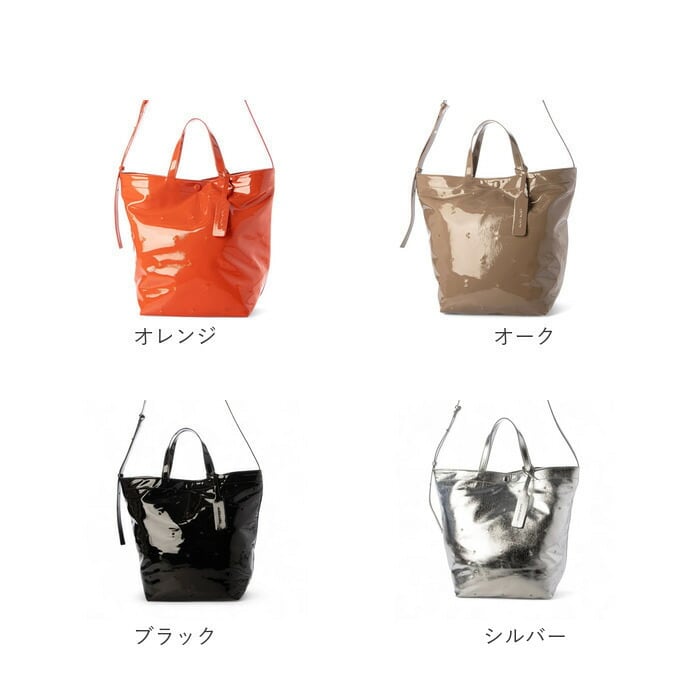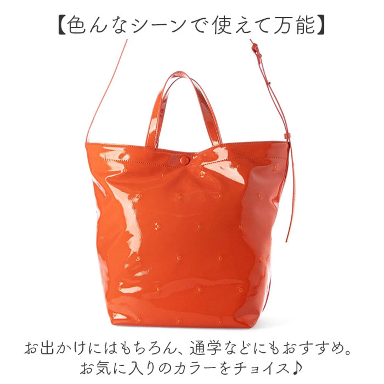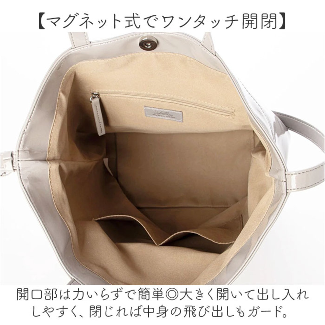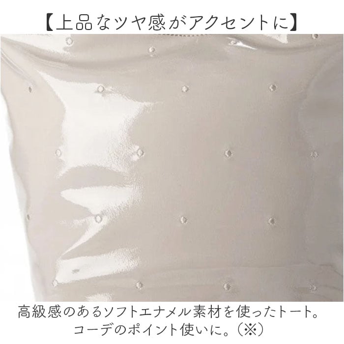 ・高級感のあるソフトエナメル素材を使ったトート。コーデのポイント使いに。