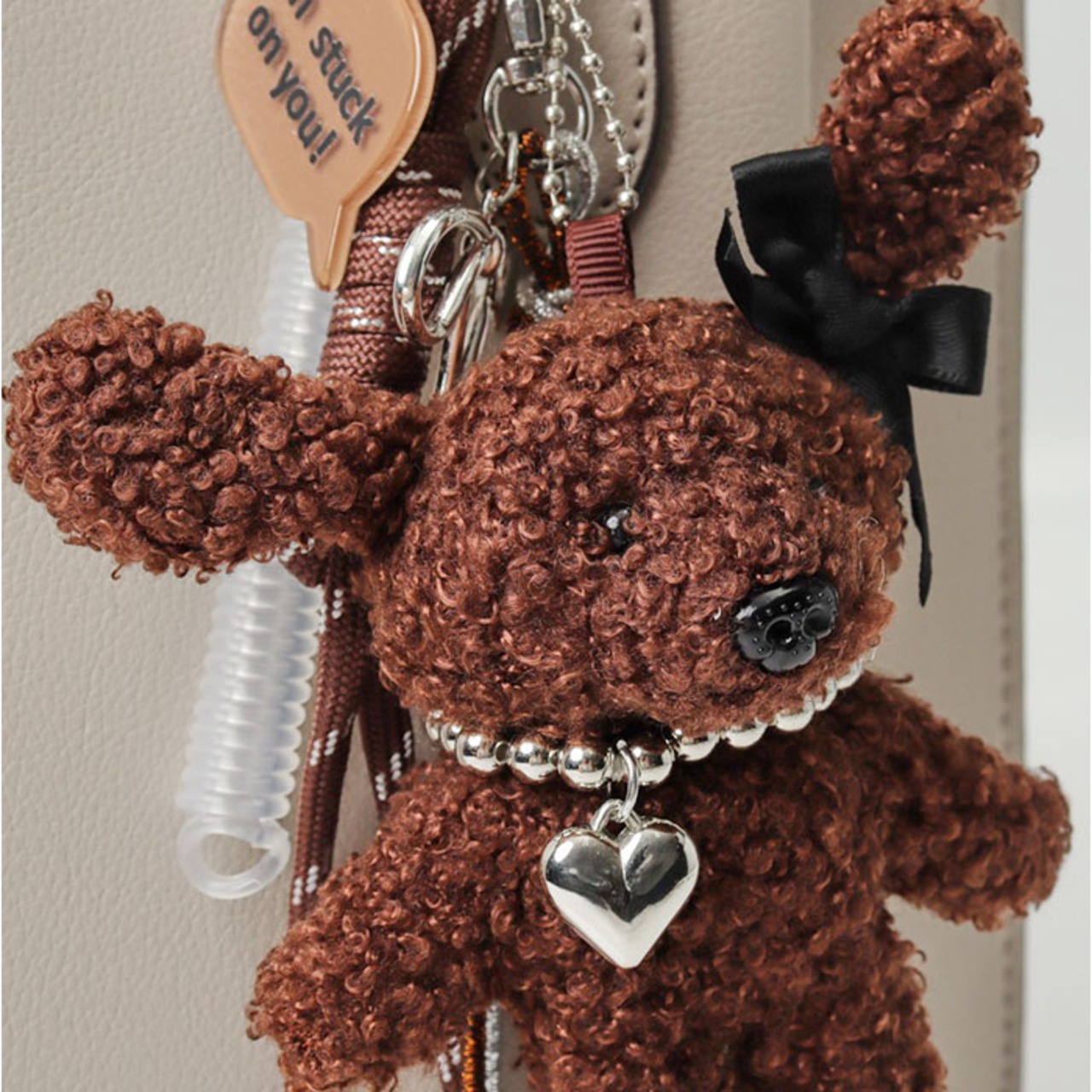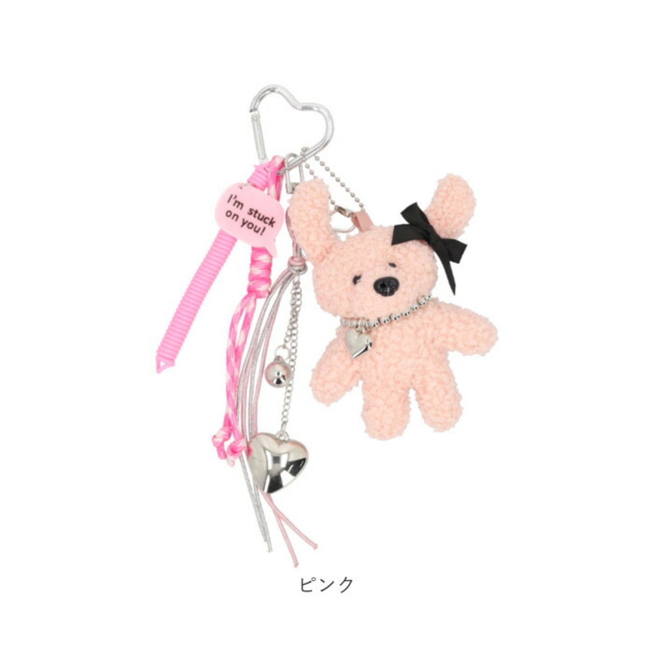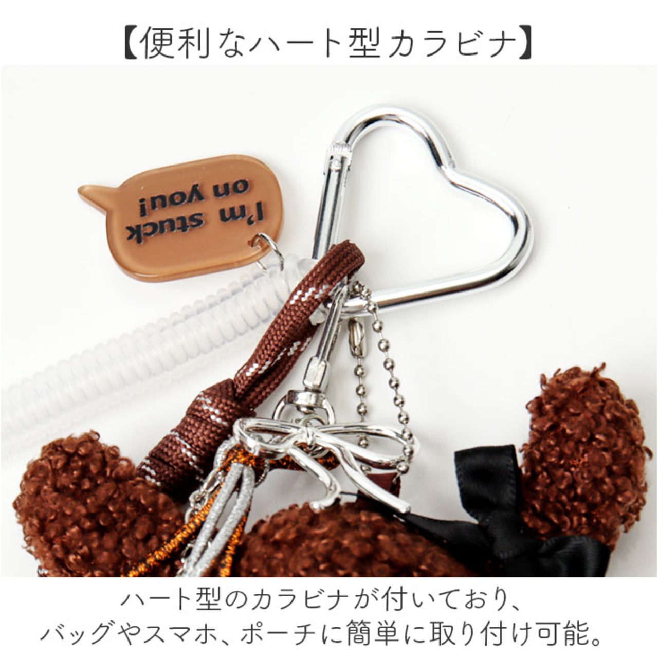 ・ハート型のカラビナが付いており、バッグやスマホ、ポーチに簡単に取り付け可能。