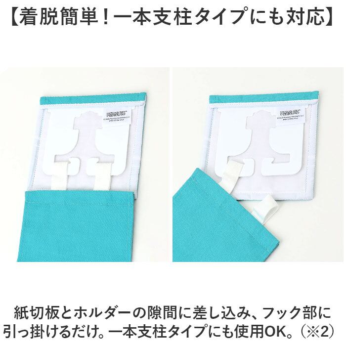 ・紙切板とホルダーの隙間に差し込み、フック部に引っ掛けるだけ。一本支柱タイプにも使用OK。