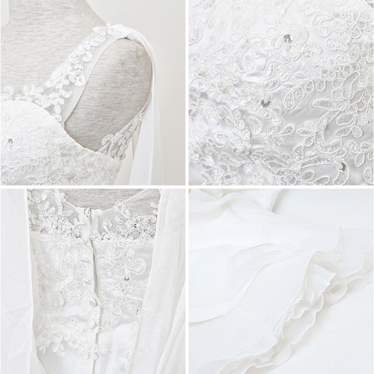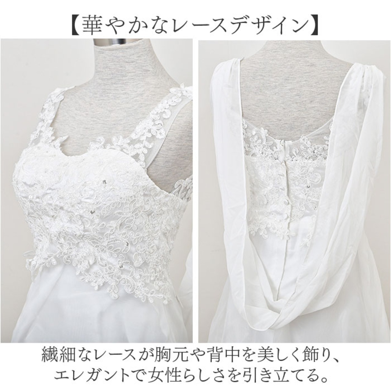 ・繊細なレースが胸元や背中を美しく飾り、エレガントで女性らしさを引き立てる。