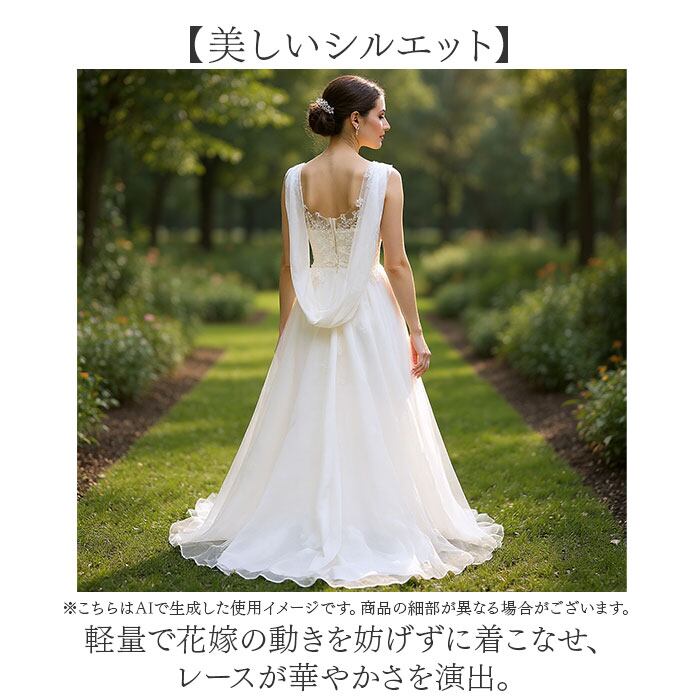 ・軽量で花嫁の動きを妨げずに着こなせ、レースが華やかさを演出。