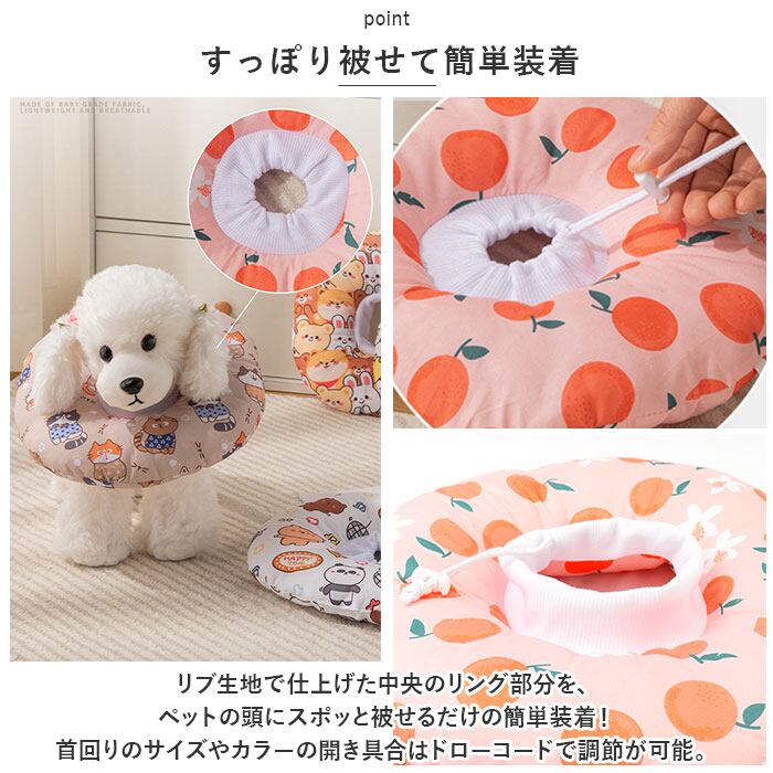 ・リブ生地で仕上げた中央のリング部分を、ペットの頭にスポッと被せるだけの簡単装着!首回りのサイズやカラーの開き具合はドローコードで調節が可能。
