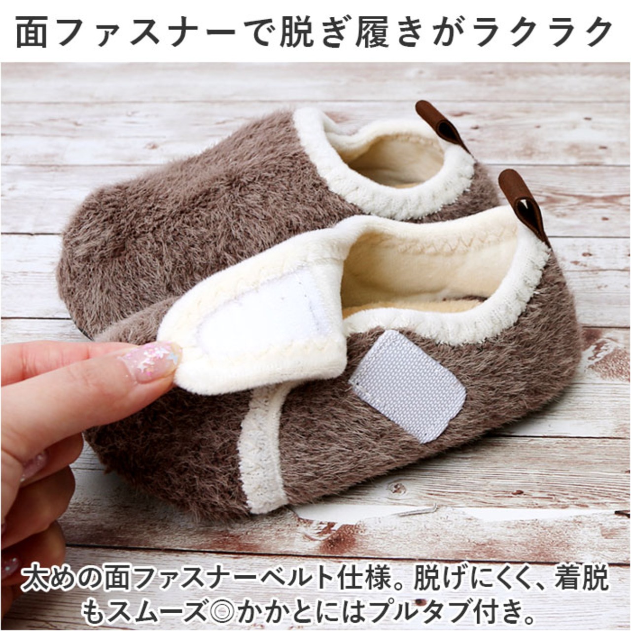 ・太めの面ファスナーベルト仕様。脱げにくく、着脱もスムーズ◎かかとにはプルタブ付き。