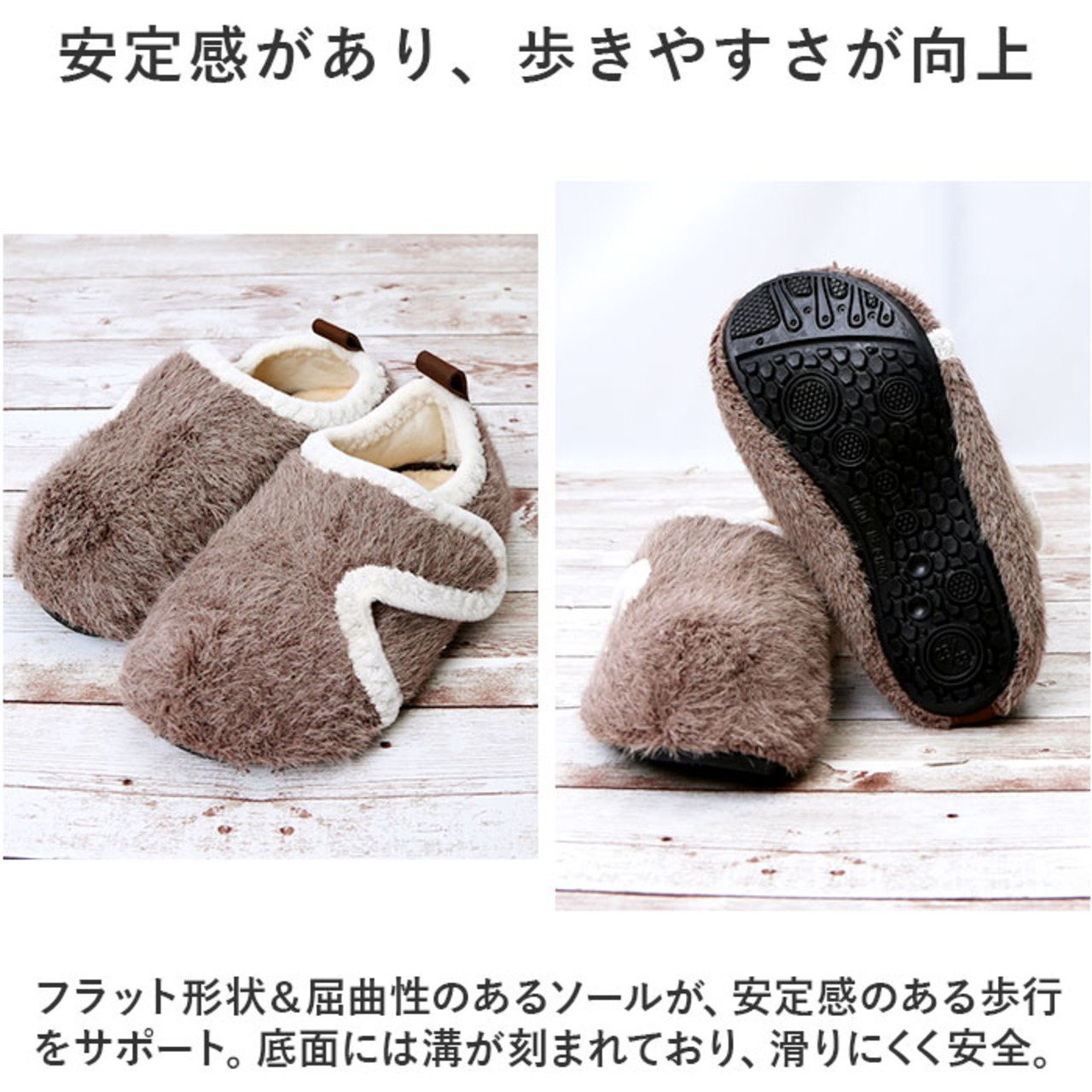 ・フラット形状&屈曲性のあるソールが、安定感のある歩行をサポート。底面には溝が刻まれており、滑りにくく安全。