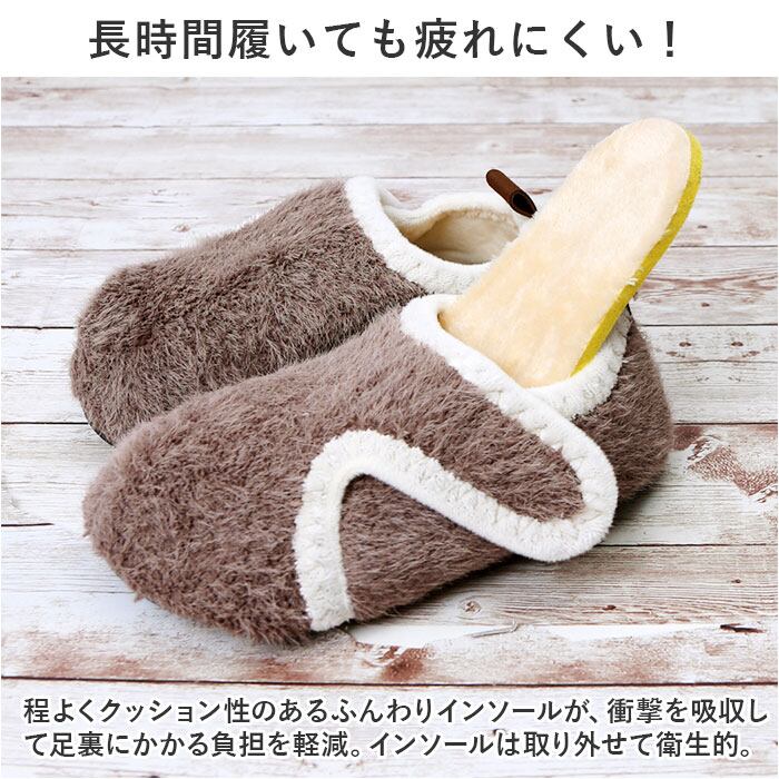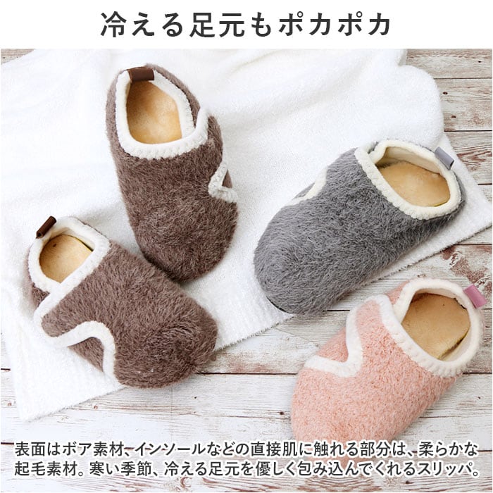 ・表面はボア素材、インソールなどの直接肌に触れる部分は、柔らかな起毛素材。寒い季節、冷える足元を優しく包み込んでくれるスリッパ。