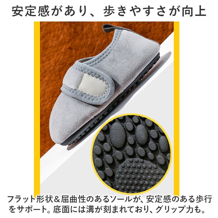 ・フラット形状&屈曲性のあるソールが、安定感のある歩行をサポート。底面には溝が刻まれており、グリップ力も。
