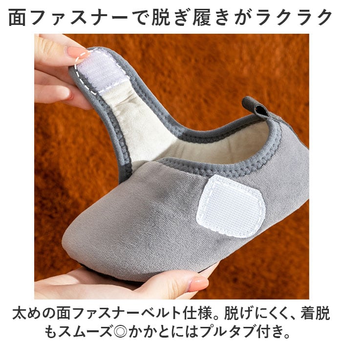 ・太めの面ファスナーベルト仕様。脱げにくく、着脱もスムーズ◎かかとにはプルタブ付き。