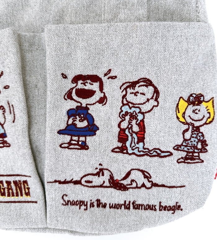 ・前面のポケットに施された、スヌーピー&フレンズのにぎやかにでカラフルな刺繍がポイント。