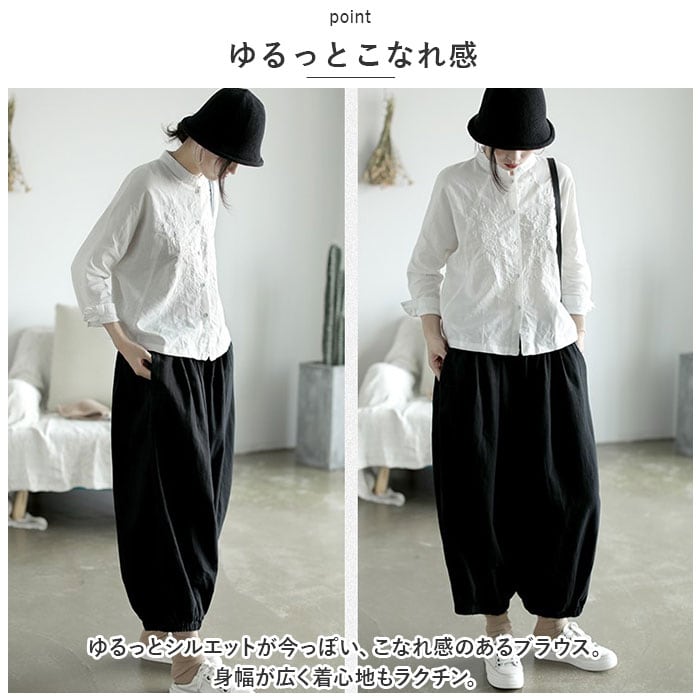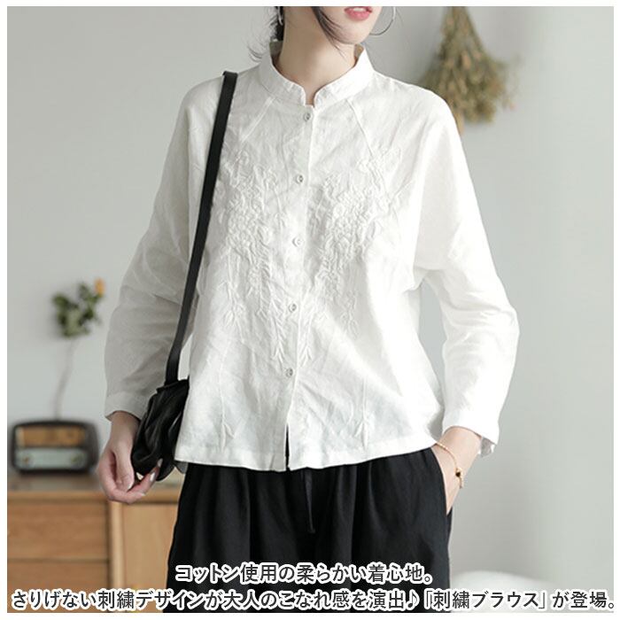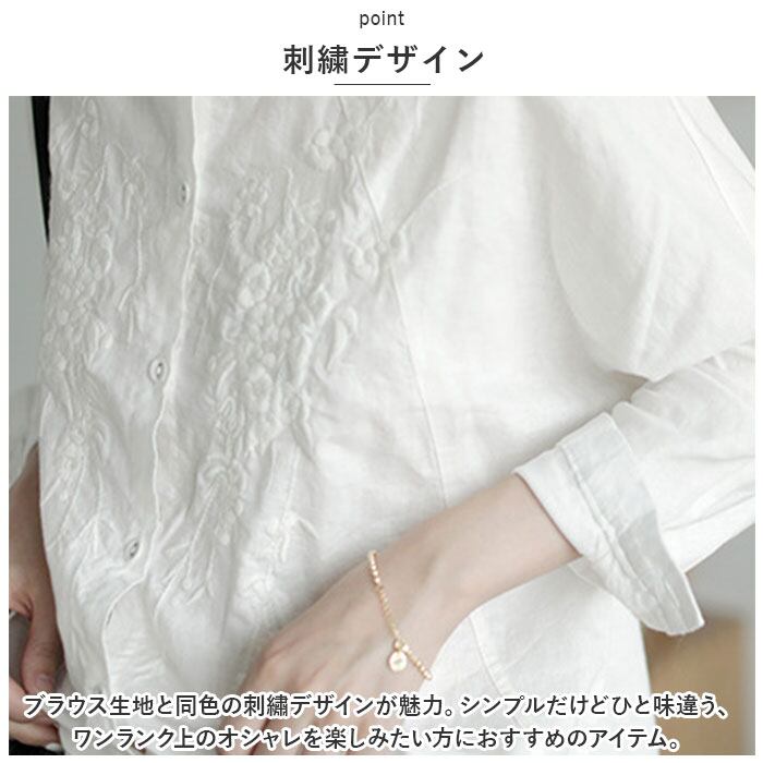ブラウス 白 長袖 刺繍 ホワイト 通販 シャツ 白シャツ ショート丈 前開き 綿麻 ゆったり コットン リネン きれいめ レディース オフィス トップス 大人 おしゃれ 通勤