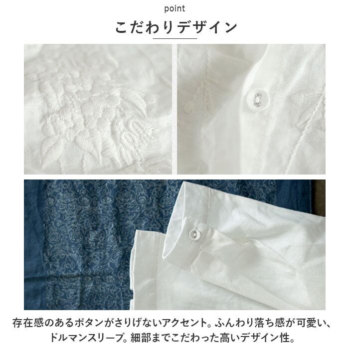 ・ブラウス生地と同色の刺?デザインが魅力。シンプルだけどひと味違う、ワンランク上のオシャレを楽しみたい方におすすめのアイテム。
