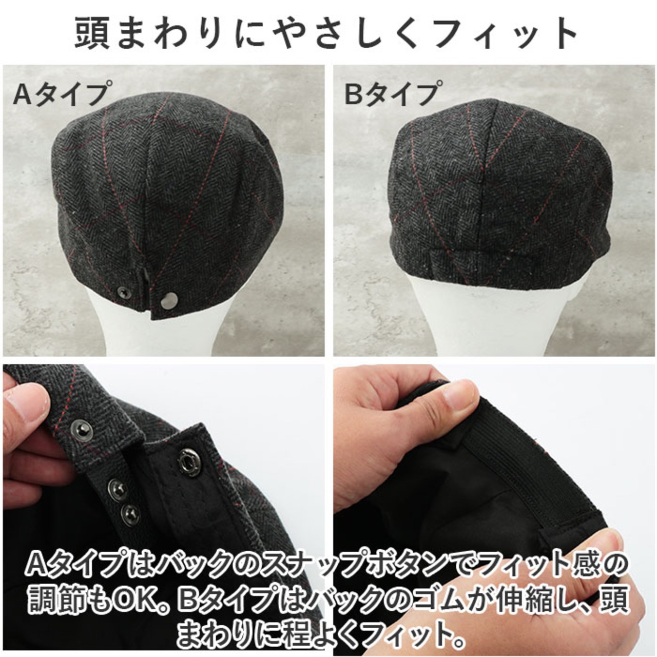 ・Bタイプはバックのゴムが伸縮し、頭まわりに程よくフィット。