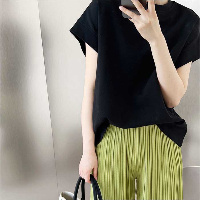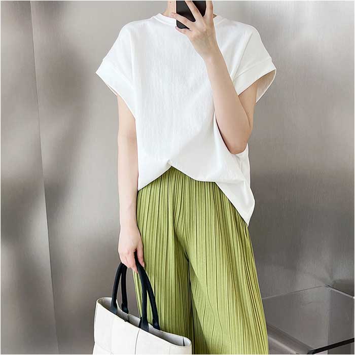 ・程よく厚みのある生地感。よれにくく、パンツにもスカートにも素敵にマッチ。