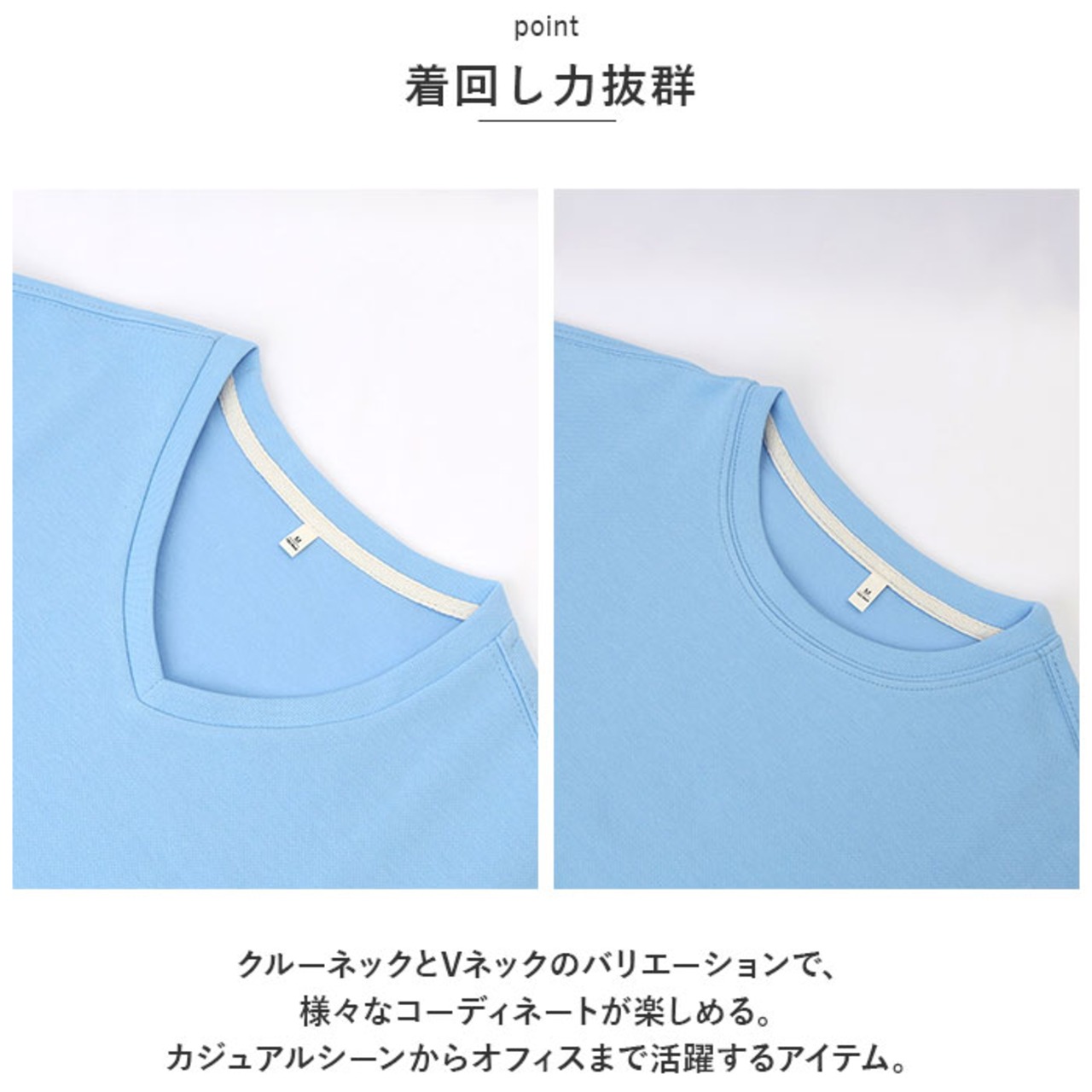 ・クルーネックとVネックのバリエーションで、様々なコーディネートが楽しめる。カジュアルシーンからオフィスまで活躍するアイテム。