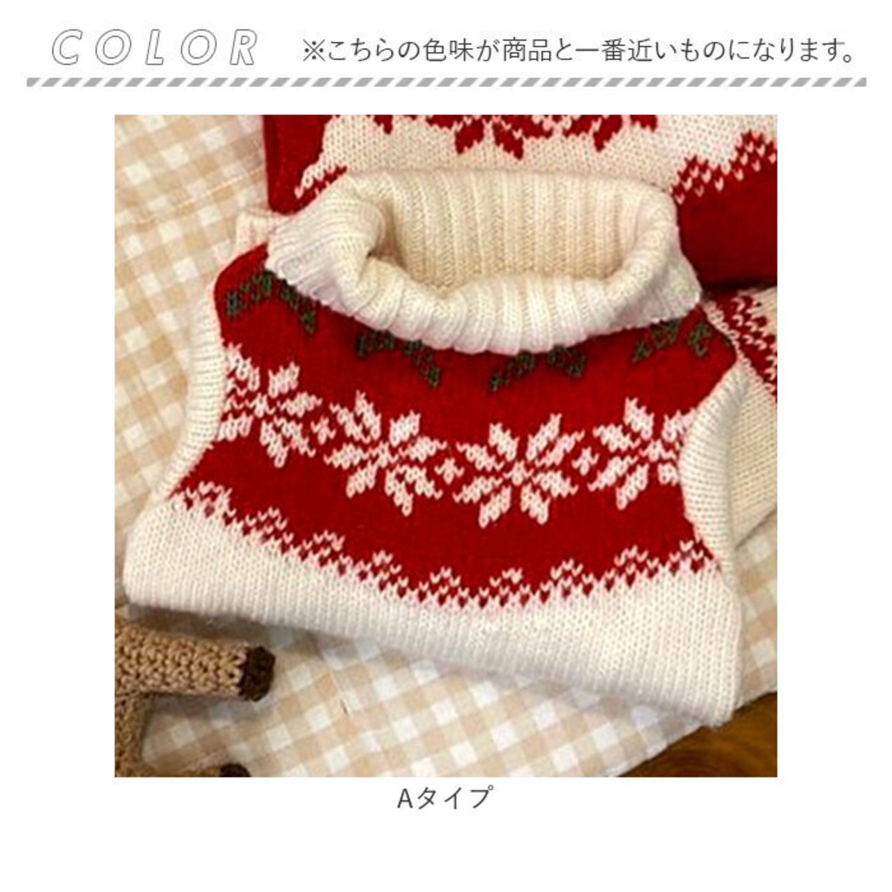・首元までぬくぬく暖かいタートルネックに、雪の結晶を華やかに散りばめた「Aタイプ・Bタイプ」。交互に並ぶベアと真っ赤なハートマークに、白いポンポンがアクセントになった「Cタイプ」など、可愛らしい絵柄からお気に入りをチョイス!(※Cタイプはタートルネックデザインではございません。ご注意ください。)