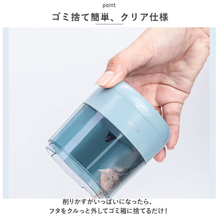 ・削りかすの溜まり具合がひと目でわかるクリアケース仕様。削りかすがいっぱいになったら、フタをクルっと外してゴミ箱に捨てるだけ!
