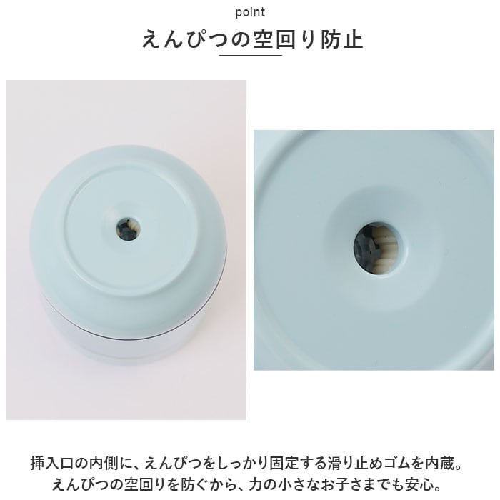 ・挿入口の内側に、えんぴつをしっかり固定する滑り止めゴムを内蔵。えんぴつの空回りを防ぐから、力の小さなお子さまでも安心。