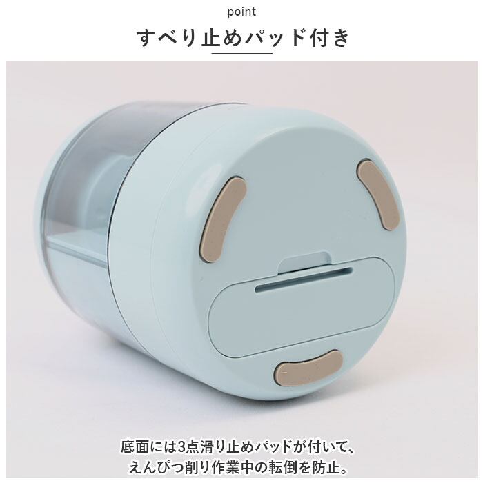 ・底面には3点滑り止めパッドが付いて、えんぴつ削り作業中の転倒を防止。