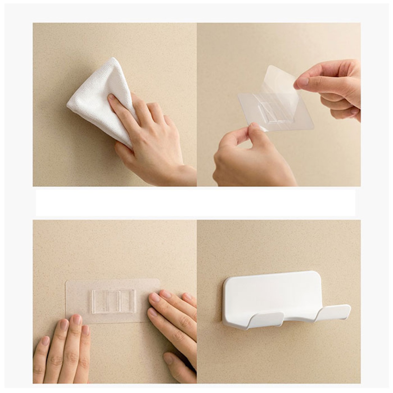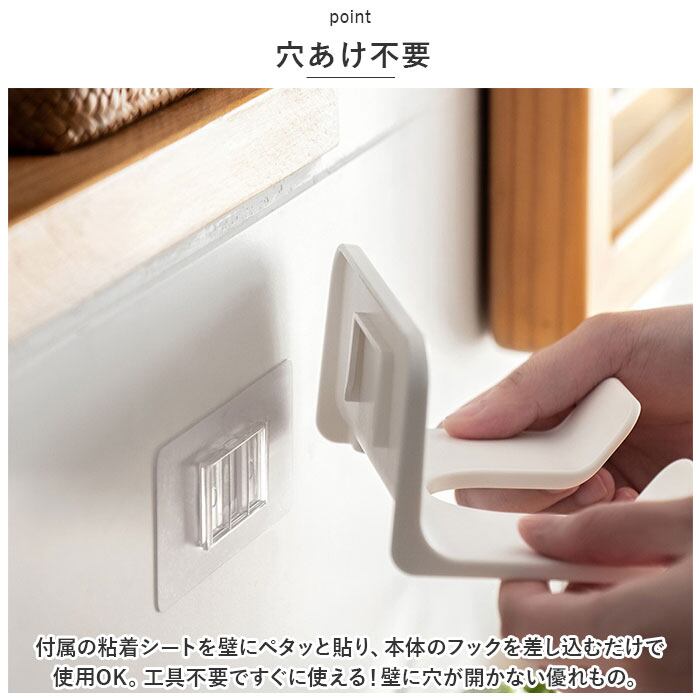 ・付属の粘着シートを壁にペタッと貼り、本体のフックを差し込むだけで使用OK。工具不要ですぐに使える!壁に穴が開かない優れもの。