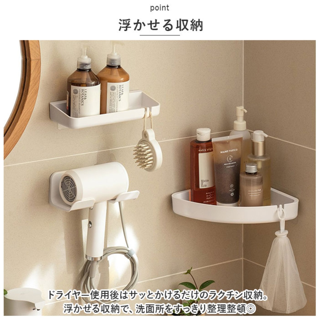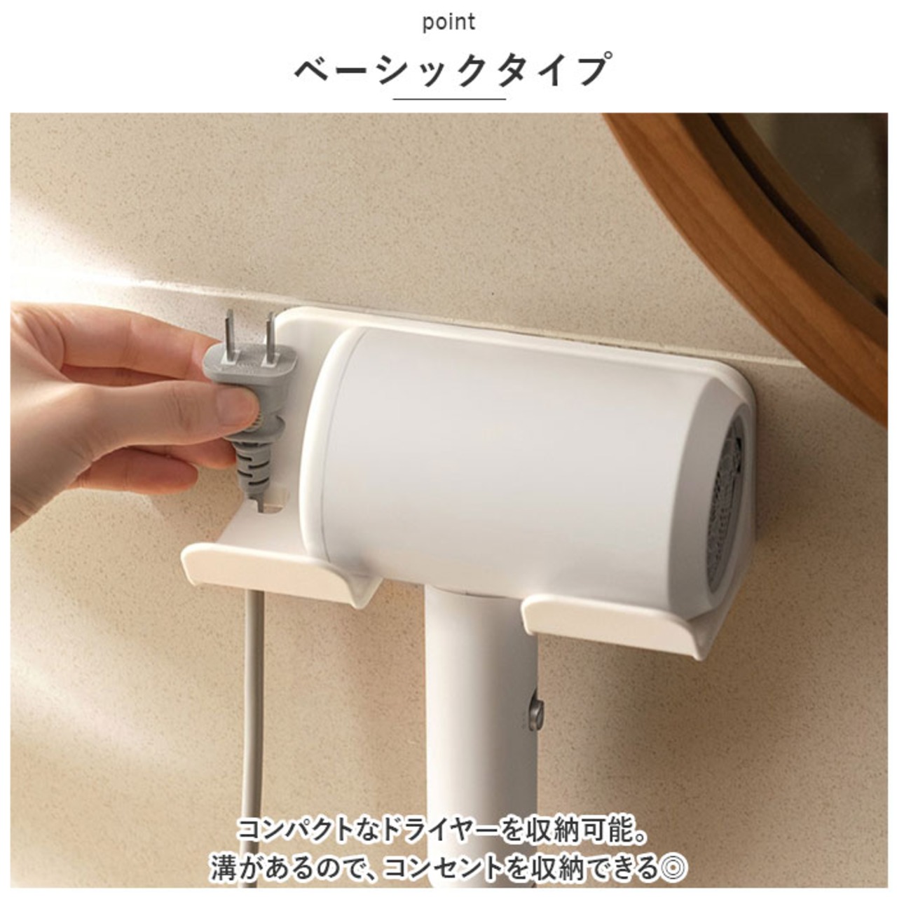 ・ドライヤー使用後はサッとかけるだけのラクチン収納。浮かせる収納で、洗面所をすっきり整理整頓◎