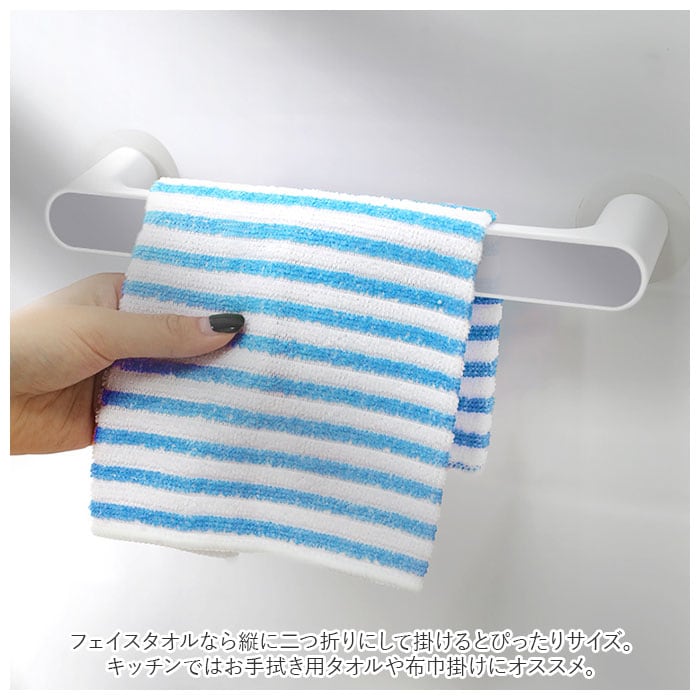 ・フェイスタオルなら縦に二つ折りにして掛けるとぴったりサイズ。キッチンではお手拭き用タオルや布巾掛けにオススメ。