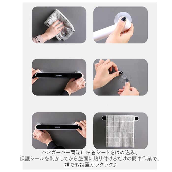 ・ハンガーバー両端に粘着シートをはめ込み、保護シールを剥がしてから壁面に貼り付けるだけの簡単作業で、誰でも設置がラクラク♪