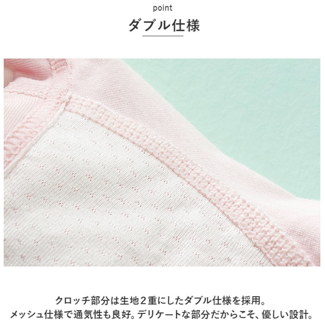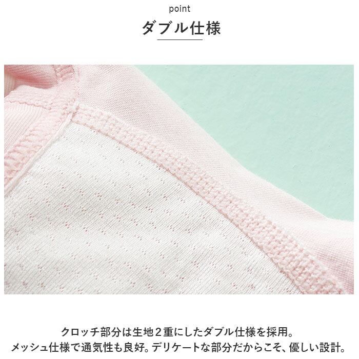・クロッチ部分は生地2重にしたダブル仕様を採用。メッシュ仕様で通気性も良好。デリケートな部分だからこそ、優しい設計。