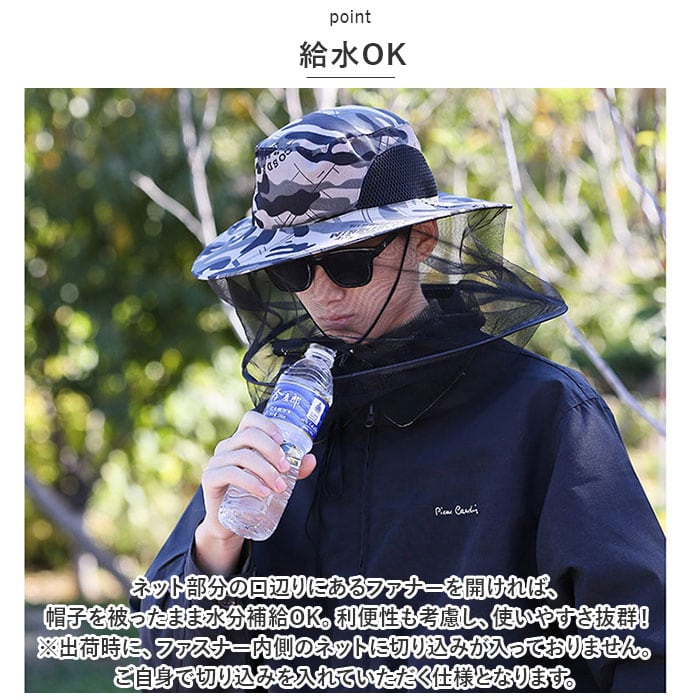 ・ネット部分の口辺りにあるファナーを開ければ、帽子を被ったまま水分補給OK。利便性も考慮し、使いやすさ抜群!