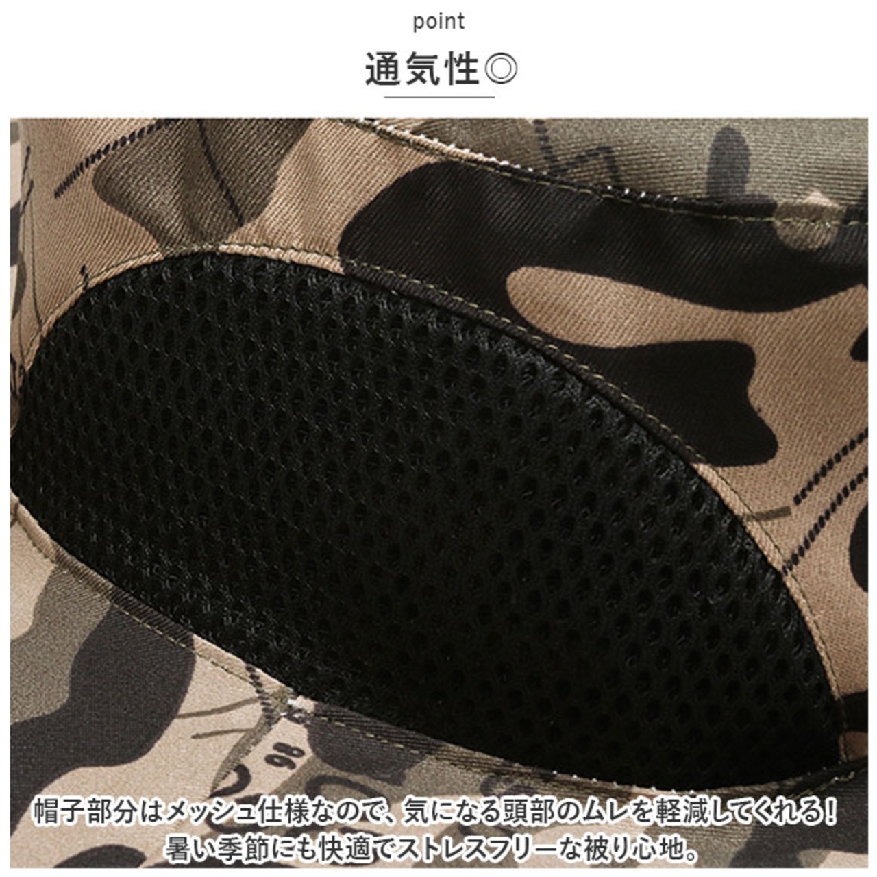 ・帽子部分はメッシュ仕様なので、気になる頭部のムレを軽減してくれる!暑い季節にも快適でストレスフリーな被り心地。