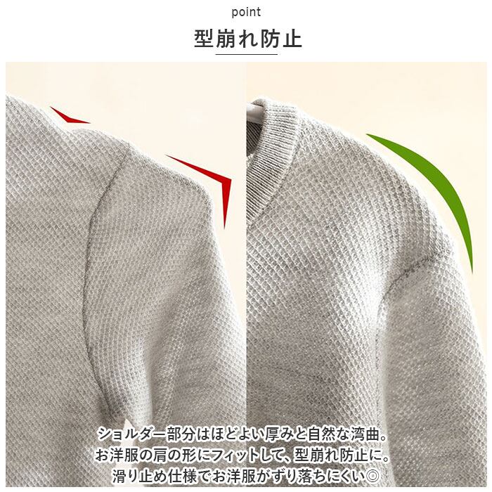 ・ショルダー部分はほどよい厚みと自然な湾曲。お洋服の肩の形にフィットして、型崩れ防止に。滑り止め仕様でお洋服がずり落ちにくい◎
