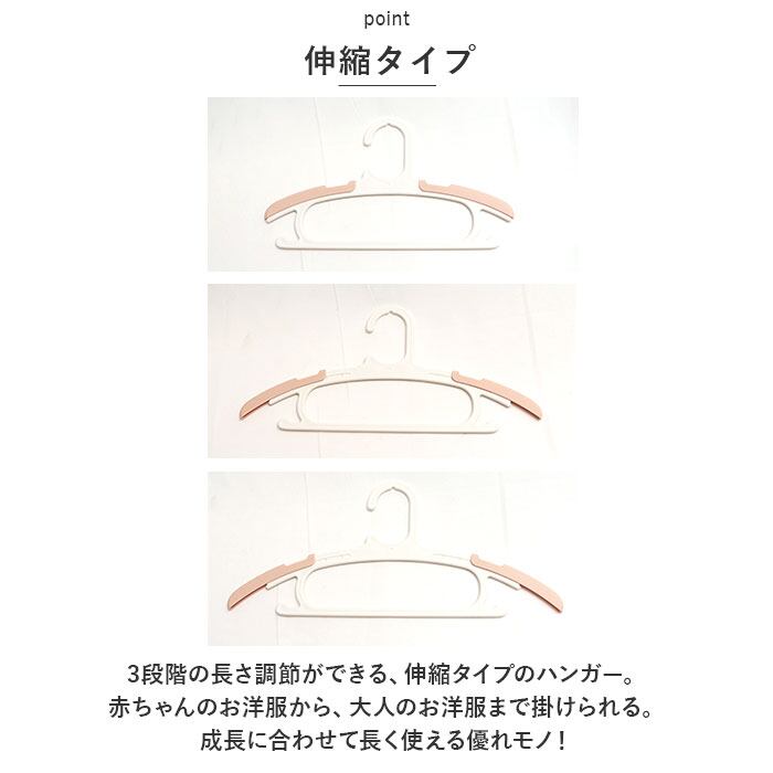 3段階の長さ調節ができる、伸縮タイプのハンガー。赤ちゃんのお洋服から、大人のお洋服まで掛けられる。成長に合わせて長く使える優れモノ!