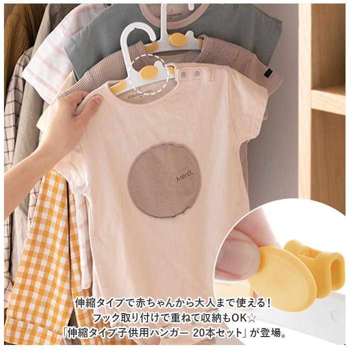 ・伸縮タイプで赤ちゃんから大人まで使える!フック取り付けで重ねて収納もOK☆「伸縮タイプ子供用ハンガー 20本セット」が登場。