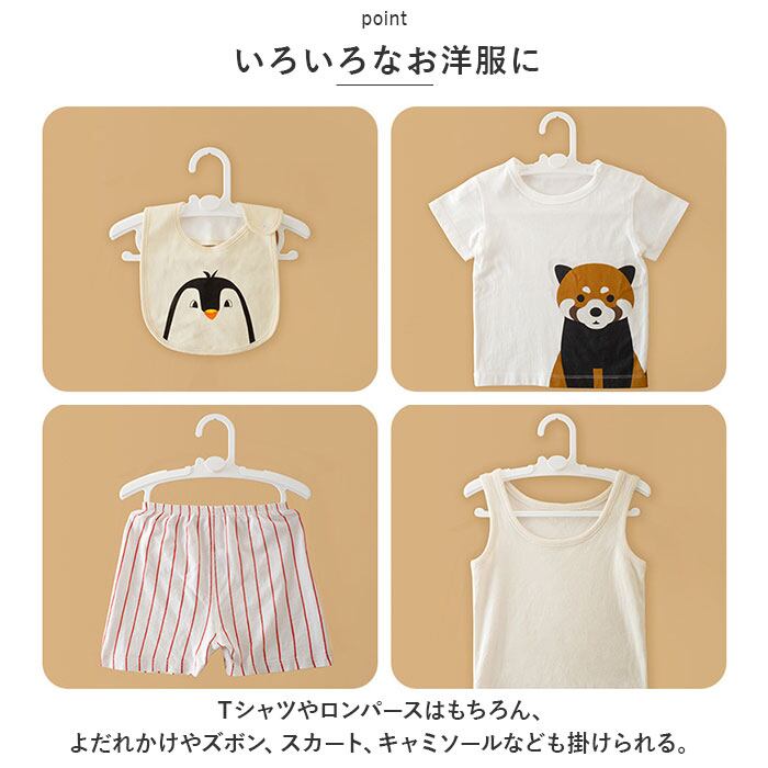 ・Tシャツやロンパースはもちろん、よだれかけやズボン、スカート、キャミソールなども掛けられる。
