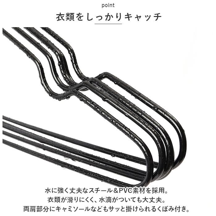 ・水に強く丈夫なスチール&PVC素材を採用。衣類が滑りにくく、水滴がついても大丈夫。両肩部分にキャミソールなどもサッと掛けられるくぼみ付き。