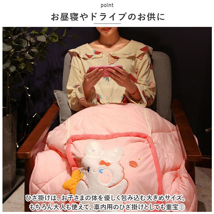 ・ひざ掛けは、お子さまの体を優しく包み込む大きめサイズ。もちろん大人も使えて、車内用のひざ掛けとしても重宝◎
