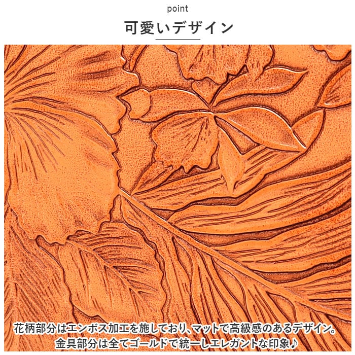 ・花柄部分はエンボス加工を施しており、マットで高級感のあるデザイン。金具部分は全てゴールドで統一しエレガントな印象♪