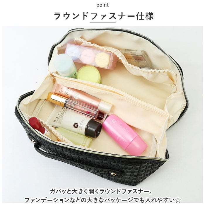 ・ガバッと大きく開くラウンドファスナー。ファンデーションなどの大きなパッケージでも入れやすい☆