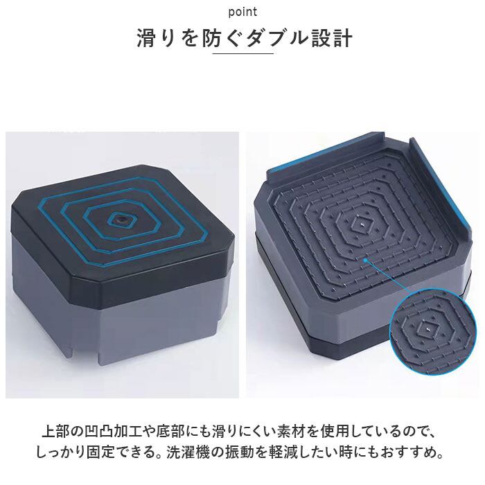 ・上部の凹凸加工や底部にも滑りにくい素材を使用しているので、しっかり固定できる。洗濯機の振動を軽減したい時にもおすすめ。