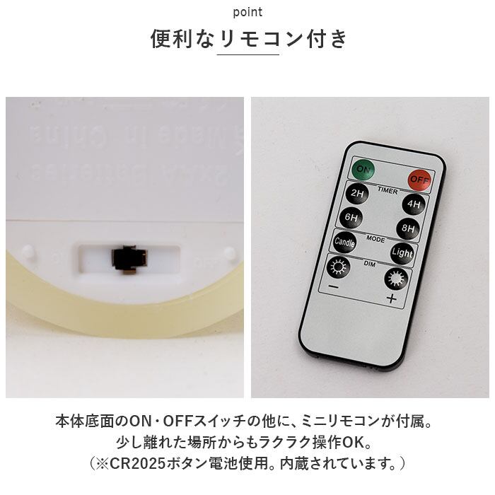 ・本体底面のON・OFFスイッチの他に、ミニリモコンが付属。少し離れた場所からもラクラク操作OK。(※CR2025ボタン電池使用。内蔵されています。)