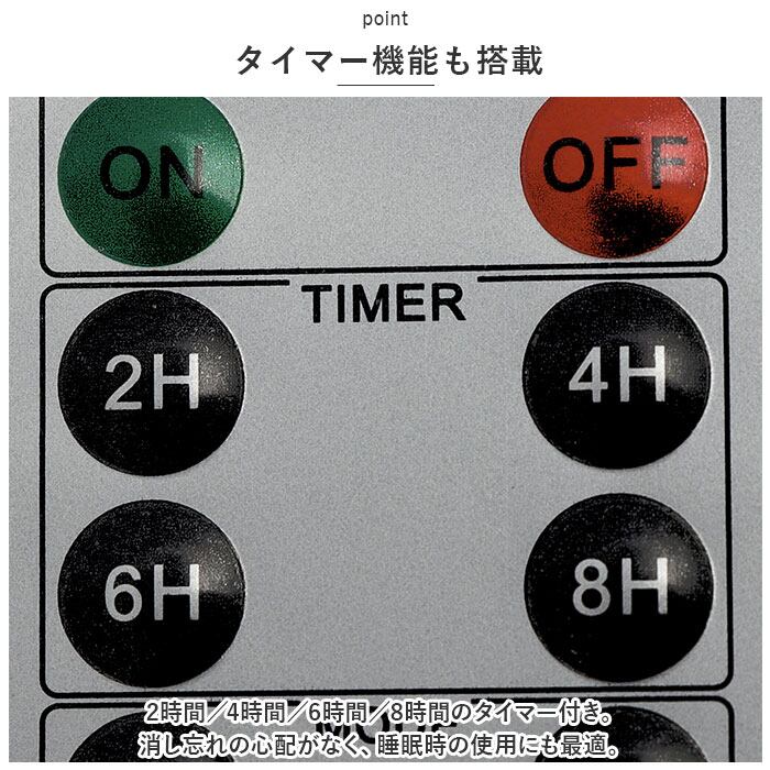 ・2時間/4時間/6時間/8時間のタイマー付き。消し忘れの心配がなく、睡眠時の使用にも最適。
